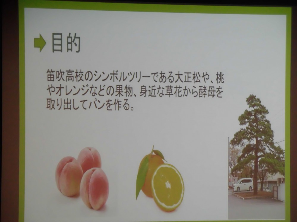 ホーム > 教育活動 > 食品化学科 > 食品化学科プロジェクト発表会(FFJ山梨笛吹高校) 2018年12月17日カテゴリー: 教育活動 食品化学科 食品化学科プロジェクト発表会(FFJ山梨笛吹高校) 12月13日プロジェクト発表会がおこなわれました。日頃『課題研究』の授業の中で2・3年生が協力して取り組んだ成果を発表しました。食品の抗菌作用、古代米、天然酵母、ワイン醸造やワインの活用法、水質浄化、災害避難所における食…等々食に関わる12の発表がありました。この科目を通じて食品化学科生徒の縦の繋がりの強さを感じました。1年生も関心を持って発表に聴き入っている様子が印象的でした。 ワインの分析法について 天然酵母からパンを作る食品の抗菌作用について 災害避難所の食について