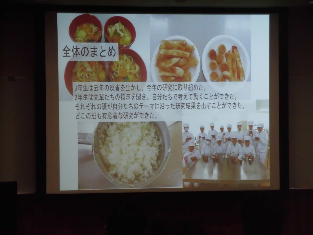 12月13日プロジェクト発表会がおこなわれました。日頃『課題研究』の授業の中で2・3年生が協力して取り組んだ成果を発表しました。食品の抗菌作用、古代米、天然酵母、ワイン醸造やワインの活用法、水質浄化、災害避難所における食…等々食に関わる12の発表がありました。この科目を通じて食品化学科生徒の縦の繋がりの強さを感じました。1年生も関心を持って発表に聴き入っている様子が印象的でした。