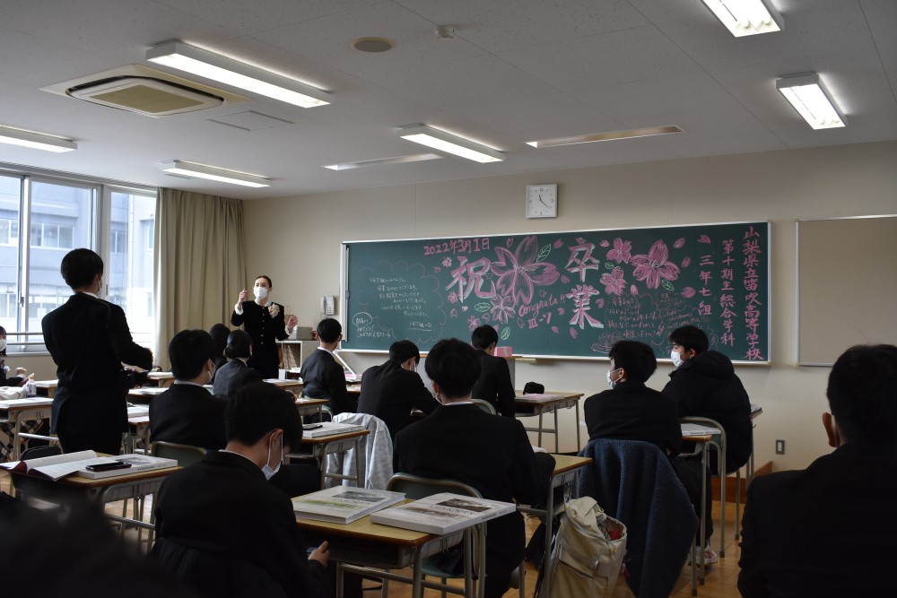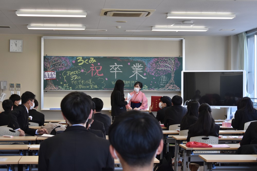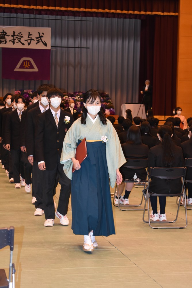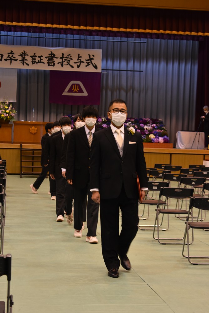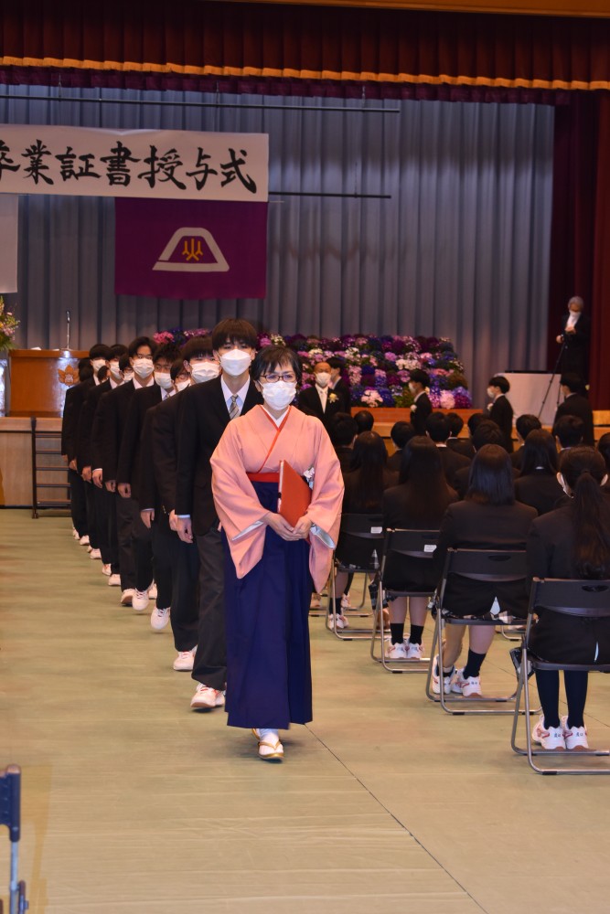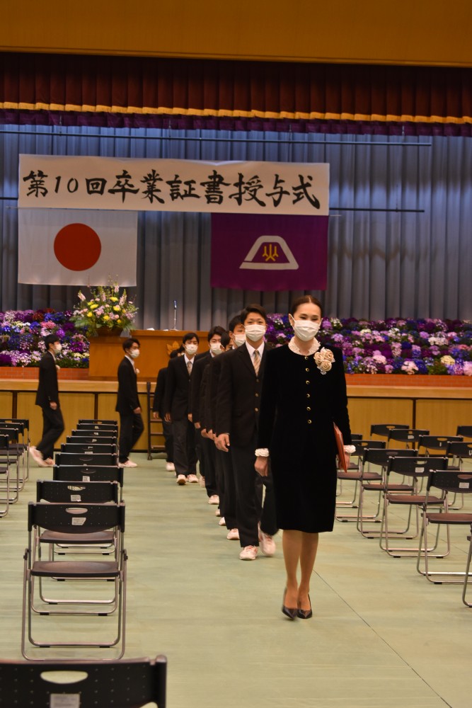 ホーム > 学校行事 > 卒業式 > 令和3年度 第10回卒業証書授与式 2022年3月1日カテゴリー: お知らせ 卒業式 学校行事 令和3年度 第10回卒業証書授与式 2022.3.1(火) 新型コロナウイルス感染症拡大にともない今年度は保護者の方の参加を見送り、教職員と卒業生のみで卒業式が行われました。 保護者の皆様には式の様子をライブ配信でお届けし視聴していただきました。 保護者の皆様、本日は誠におめでとうございます。皆様がこれから歩んでいく未来に幸多からんことを心よりお祈り申し上げます。