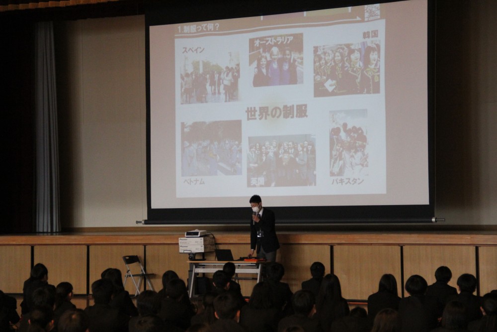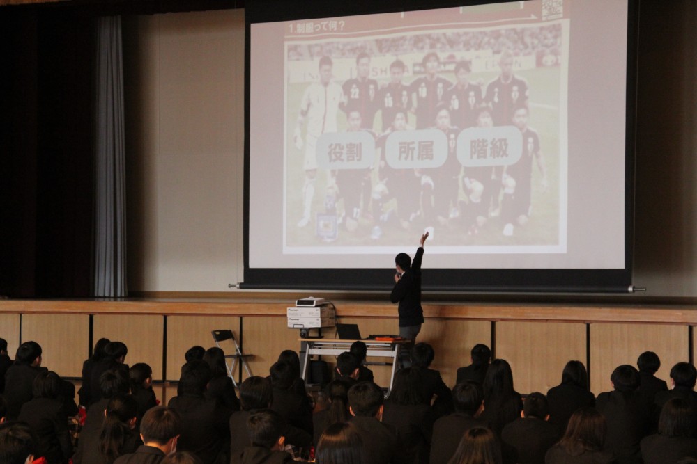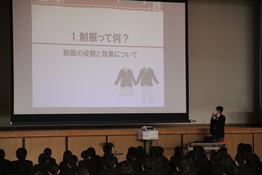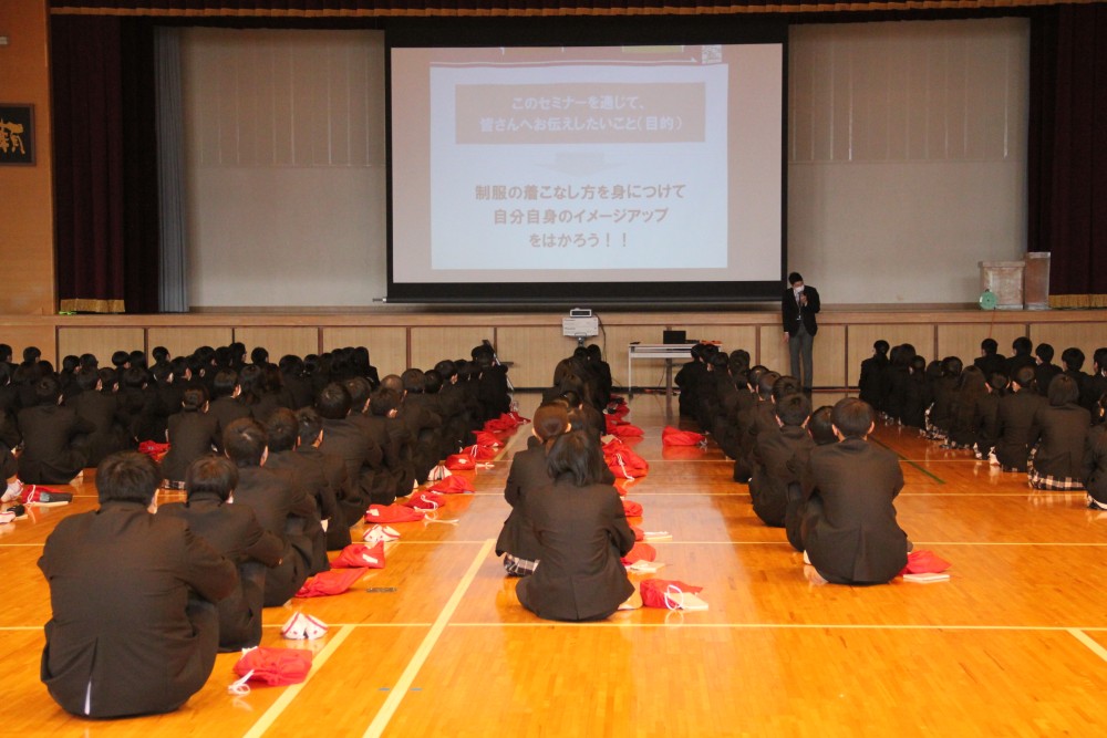 制服を通じて身だしなみの大切さを理解し、TPOを意識した着こなし方やマナーを学ぶことを目的に、「山梨菅公学生服」より講師をお招きして「制服着こなしセミナー」を実施しました。新入生の皆さんは熱心に話を聞きました。