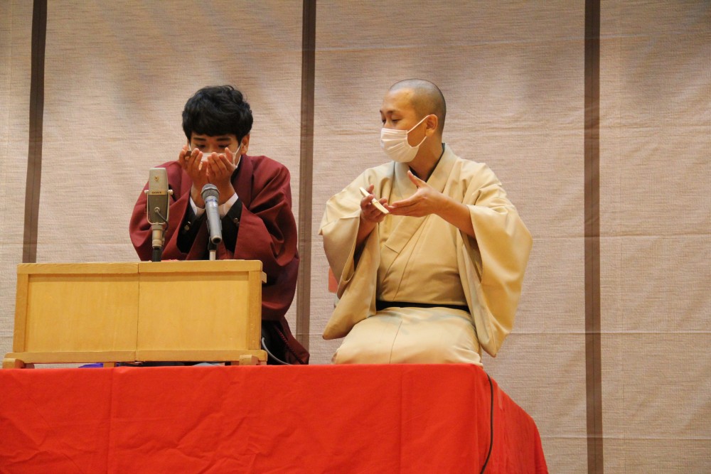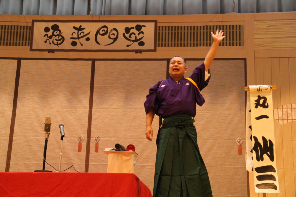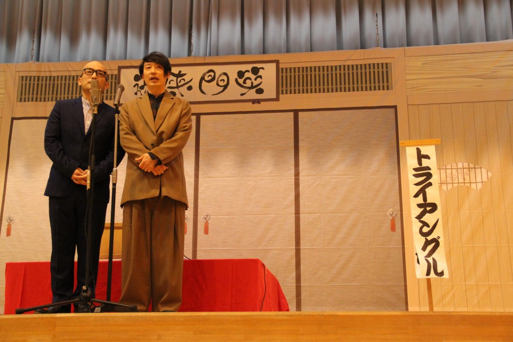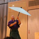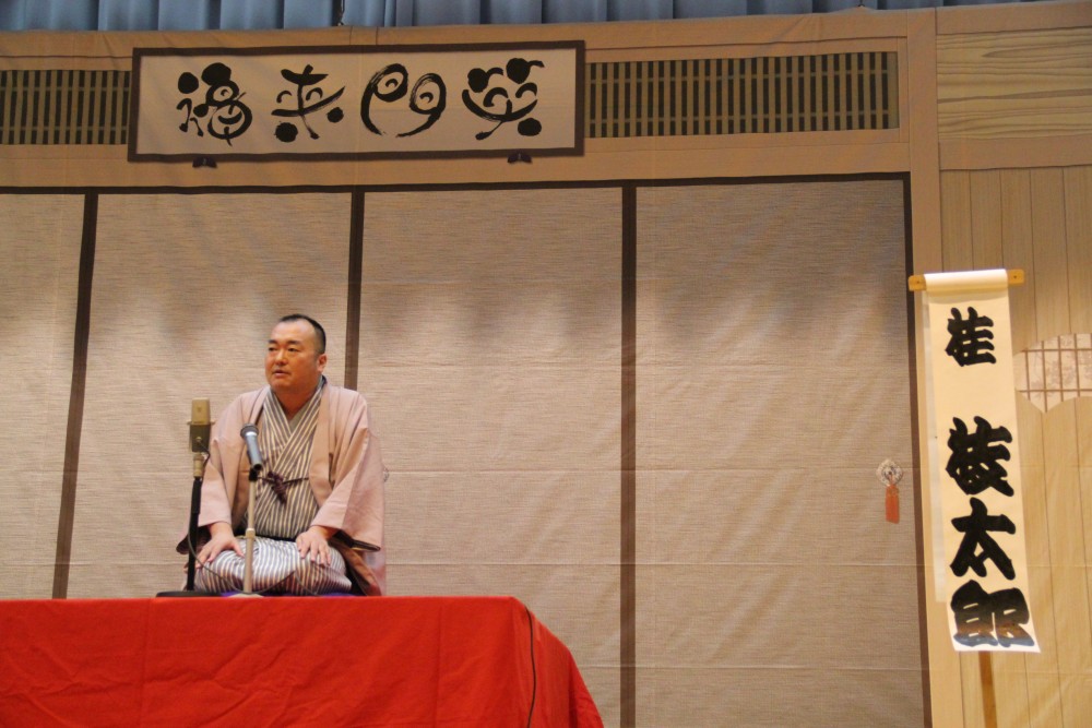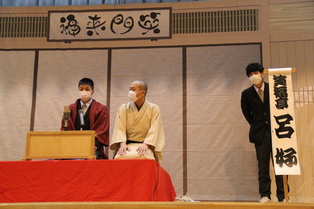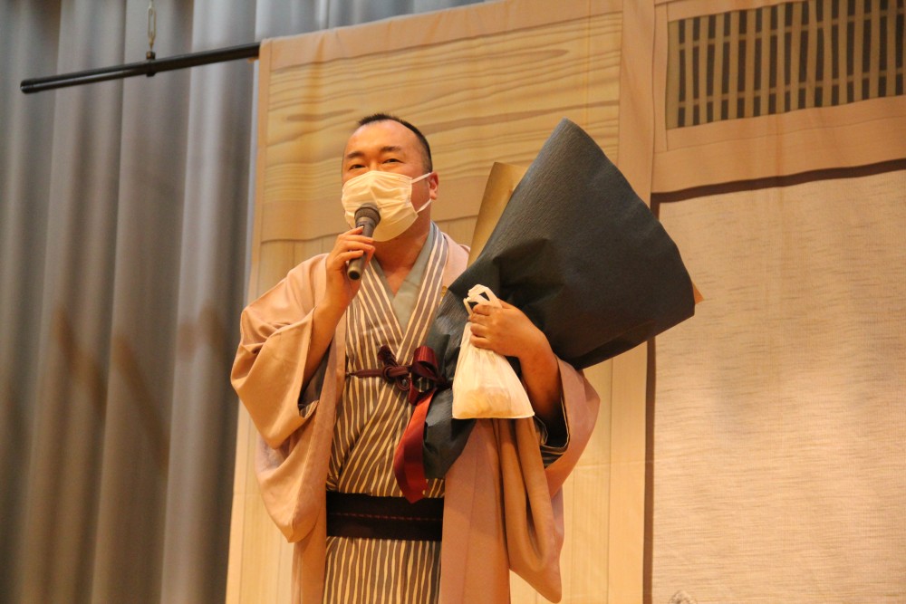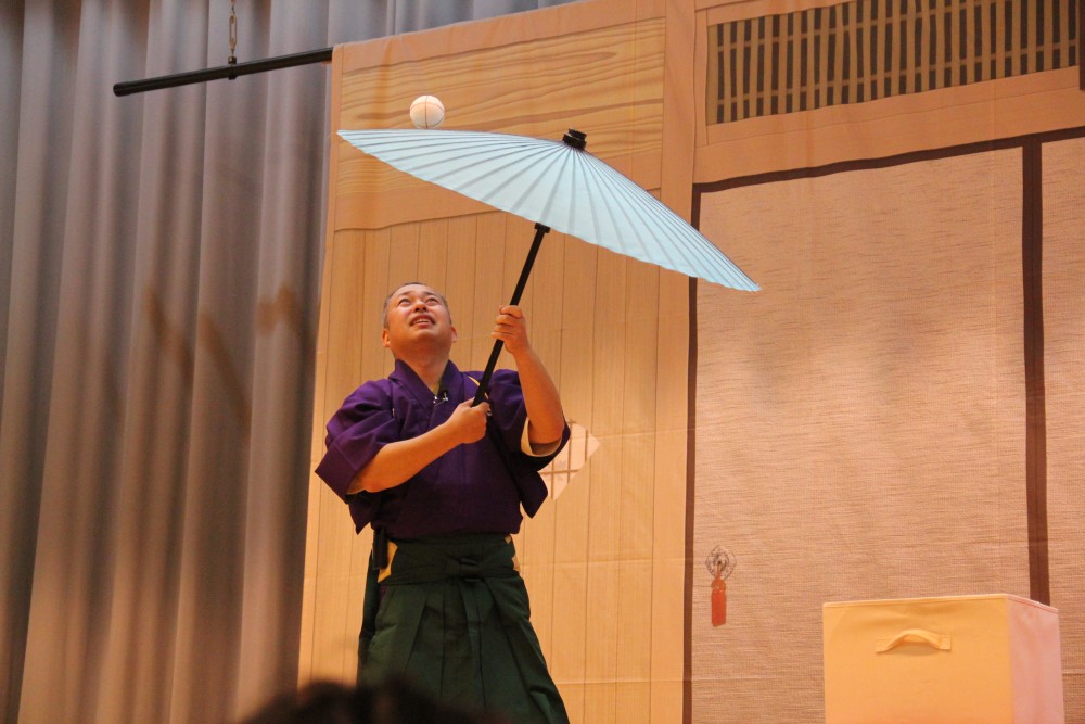 10月28日(金)5,6校時、本校体育館を会場に芸術鑑賞会が行われました。3年振りの開催となる今年度は、「日本古典芸能」の「落語」「漫才」「太神楽」の演目を鑑賞し、大いに笑い、楽しい時間を共有することができました。落語と漫才の体験コーナーでは、挑戦した生徒たちと教員が個性を発揮し、出演者との駆け引きもとても盛り上がりました。