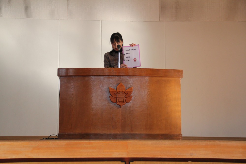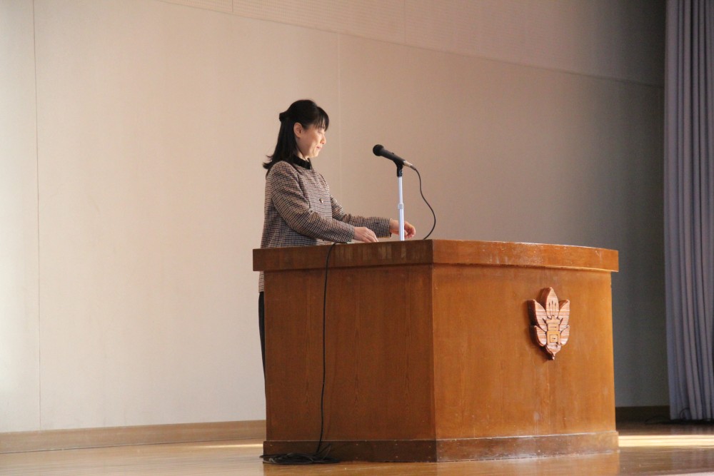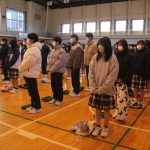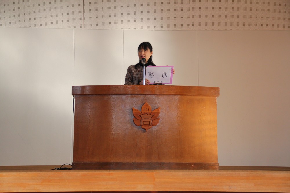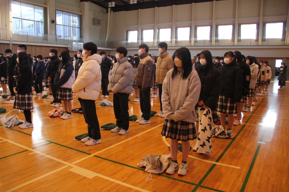 2023.1.6(金)「3学期始業式」が行われました。体育館へ3年生が集合し、1・2年生は教室でリモート参加しました。校長先生は令和4年を象徴する漢字の「戦」や、令和5年の干支の「癸 卯」の文字を紹介しながら昨年を振り返り、生徒一人ひとりに「笛吹GP」を基に今年の指針や抱負の持ち方について、分かりやすくお話くださいました。