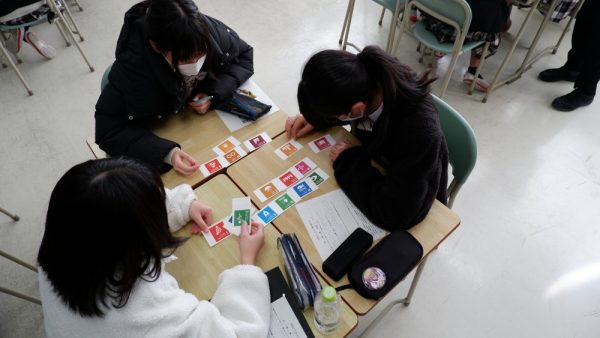 インターンシップ最終日。1年生のみなさん、学校を離れ慣れない環境での実習お疲れ様でした。期間中、多くの1年生が校外の各所で体験活動を行いましたが、事業所の都合等により実習ができなかった生徒もいました。今回は学校で行われた外部講師による『キャリア体験特別講座』を紹介します。1日目は「パソコンを使ってチラシデザイン演習」、2日目は「マナー&コミュニケーション講座」、3日目は「2030 SDG‘sカードゲーム」というプログラムでした。参加した生徒たちは、普段の学校や家庭生活では得ることのできない多くのことを学び、進路へ関してたくさんの気づきがあった様子です。