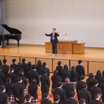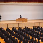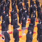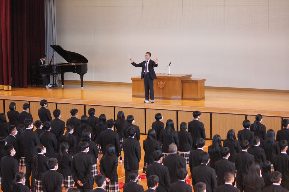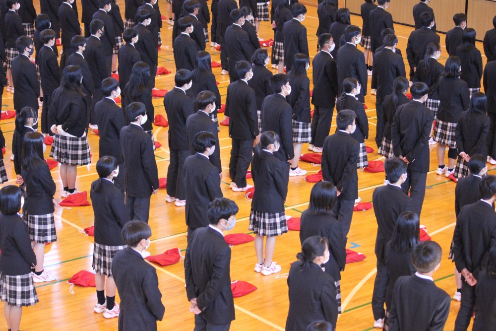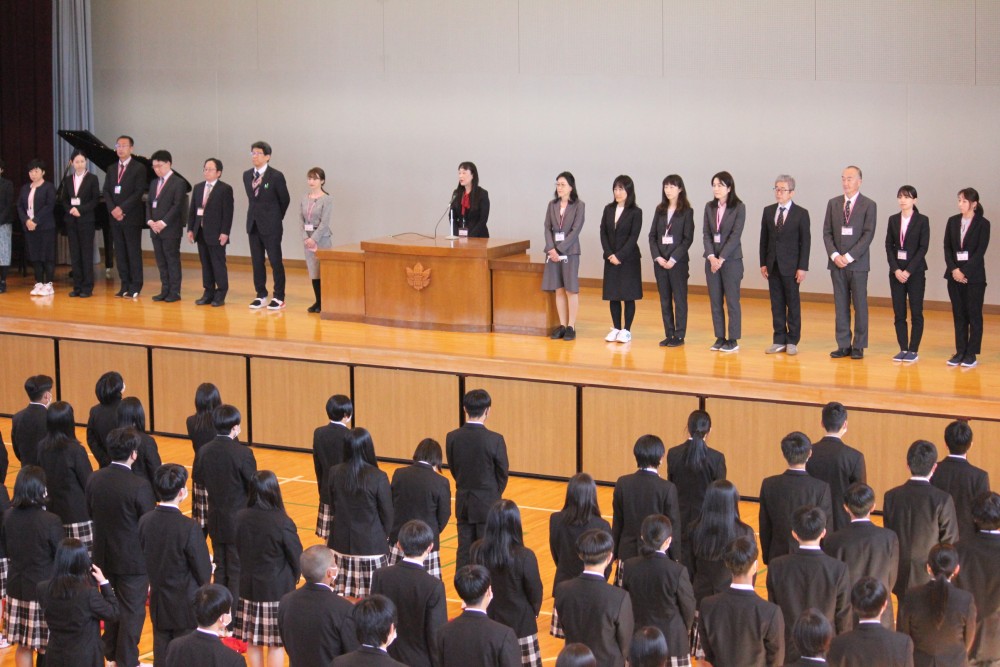 体育館に参集し新任式、始業式が行われました。始業式では、校長先生のお話、分掌主任・学年担任・部顧問等の発表、そして校歌斉唱が行われました。凛とした空気感の中、マスクを着用してですが全員で校歌が斉唱でき一体感のあるスタートとなりました。