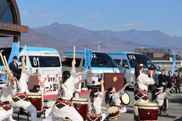 ホーム > 部活動 > すいれき太鼓 > すいれき太鼓部 笛吹市 AIデマンド出発式 2024年1月19日カテゴリー: 部活動 すいれき太鼓 すいれき太鼓部 笛吹市 AIデマンド出発式 2024.1.15(月) 皆さんこんにちは!すいれき太鼓部です! 本日、のるーと笛吹運行開始式典で演奏させて頂きました。ありがとうございました。 式典の中で貴重な時間をいただいき、演奏させていただいたことは大きな喜びです。 部員一同、心を込めて演奏させていただきました。 寒い中ご覧くださった皆様ありがとうございました。 これからも1つひとつの演奏に心を込め、お届けしていきたいと思います。応援をよろしくお願いいたします。