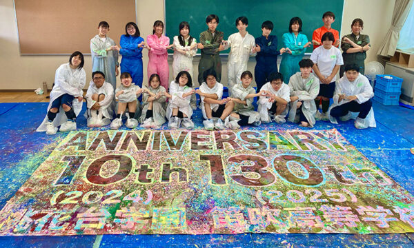 ホーム > 部活動 > 美術 > 【美術部】桃花台学園美術部と合同制作 2025年7月29日カテゴリー: 部活動 美術 【美術部】桃花台学園美術部と合同制作 桃花台学園の美術部と合同制作をしました。 今年3月に合同で実践した「アクション・ペインティング」の続編です。 今回は文字が浮き出るようにマスキングを施した上からドロッピングなどを行い、 両校の創立を記念する作品に仕上がりました。 校内にて展示する予定ですので、学校にお越しの際はぜひご覧ください。