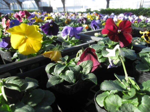 1月に入り、甲府盆地は連日氷点下の最低気温を記録するため、パンジー、ビオラのポット苗は温室内で管理しています。
